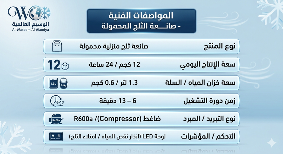 قدرة إنتاجية هائلة: تصل إلى 12 كجم من الثلج يومياً لتلبية كافة احتياجاتك بكفاءة عالية.
