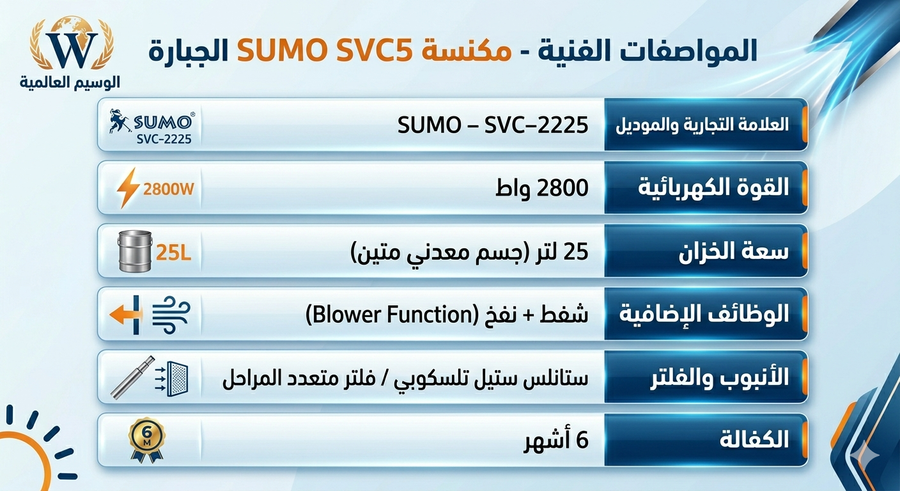 وداعاً للأتربة والعناء، ورحبي بالنظافة الاحترافية الشاملة مع مكنسة SUMO الكهربائية موديل SVC-2225 الجبارة، المتوفرة الآن في الوسيم العالمية. صُممت هذه المكنسة لتكون الحل الأقوى للمساحات الكبيرة والديوانيات في الكويت، حيث تجمع بين المحرك العملاق بقوة 2800 واط والخزان المعدني الضخم سعة 25 لتر لشفط لا مثيل له.