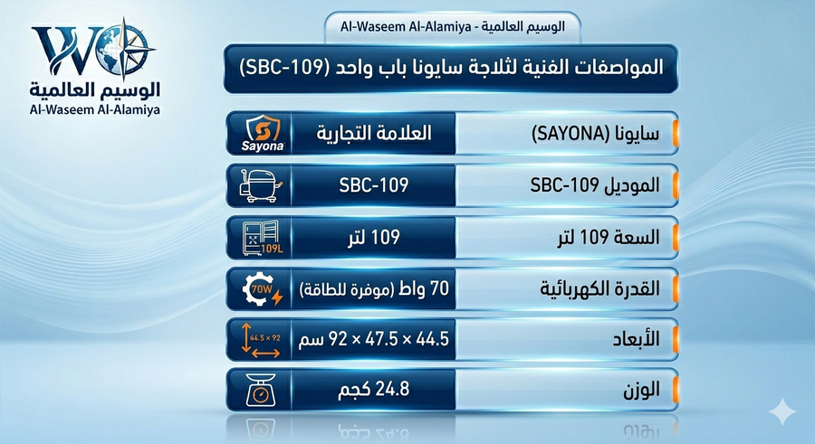 تخلص من عناء البحث عن ثلاجة مدمجة واحترافية. احصل على ثلاجة سايونا (Sayona) باب واحد موديل SBC-109 الجبارة، المتوفرة الآن في الوسيم العالمية. تجمع هذه الثلاجة بين الفخامة والعملية بتصميم أسود ملكي، مما يجعلها الخيار الأنسب للمكاتب، غرف النوم، وحتى الفنادق في الكويت بامتياز وبذكاء.