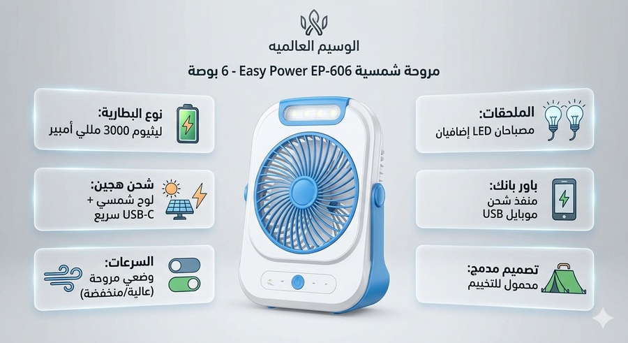 الاستثمار في مروحة Easy Power EP-606 الشمسية هو الخطوة الأنسب للحصول على تبريد وإضاءة في جهاز واحد. في متجر "الوسيم العالمية"، نحرص على توفير حلول الطاقة البديلة التي تخدم احتياجاتكم العصرية، ونحن هنا دائماً لدعمكم.