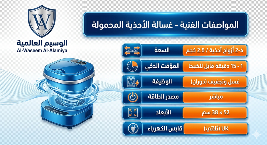 احصل على غسيل سريع وفعّال للأحذية والملابس الخفيفة مع غسالة الأحذية المحمولة الجبارة من الوسيم العالمية. صُممت هذه الغسالة لتكون الحل الأقوى للمساحات الكبيرة والديوانيات في الكويت بامتياز وبذكاء، حيث تجمع بين المحرك العملاق والهدوء التام لضمان نسيم بارد ومنعش يلطف الحرارة بذكاء كبير. تصميمها المدمج والخفيف يجعلها مثالية جداً للمسافرين، الطلاب، والأسر الصغيرة بامتياز وبذكاء، ولن تحتاج للقلق بشأن المساحة المحدودة في المنزل بامتياز بذكاء.
