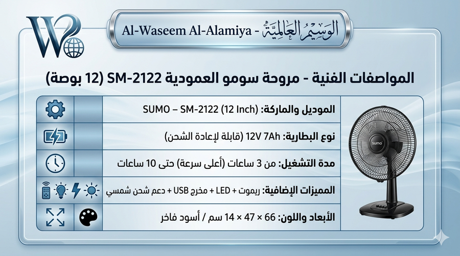تخلص من عناء البحث عن التبريد والإنارة في الرحلات وحالات الطوارئ. احصل على مروحة سومو العمودية موديل SM-2122 الجبارة، المتوفرة الآن في الوسيم العالمية. صُممت هذه المروحة لتكون الحل الأقوى للمساحات الكبيرة والديوانيات في الكويت، حيث تجمع بين المحرك العملاق بقدرة 50 واط والهدوء التام لضمان نسيم بارد ومنعش يلطف الحرارة بذكاء كبير.