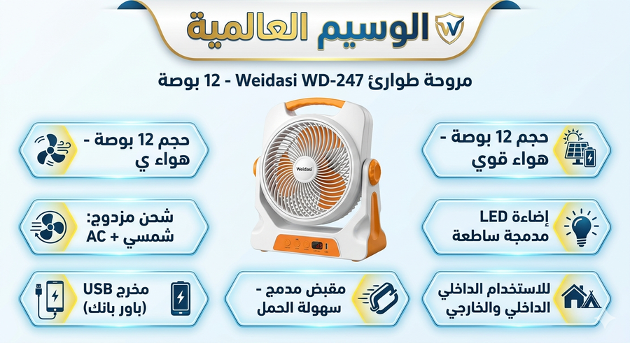 تعتبر مروحة الطوارئ القابلة للشحن Weidasi موديل WD-247 الخيار الأمثل لمواجهة حرارة الصيف وانقطاع التيار الكهربائي في الكويت. تم تزويد هذه المروحة بلوح شمسي خارجي عالي الكفاءة، مما يسمح لكِ بإعادة شحن البطارية نهاراً عبر أشعة الشمس لتعمل بكفاءة طوال الليل. تساهم ريش المروحة بحجم 12 بوصة في توفير تدفق هواء قوي ويغطي الغرفة أو الخيمة بالكامل، بينما يمنحكِ الهيكل المتين ثباتاً تاماً أثناء التشغيل. مع هذا الجهاز، ستتخلصين تماماً من القلق حيال توفر مصادر الطاقة، وتحصلين على انتعاش لا ينقطع.